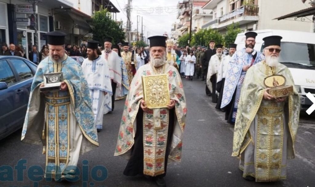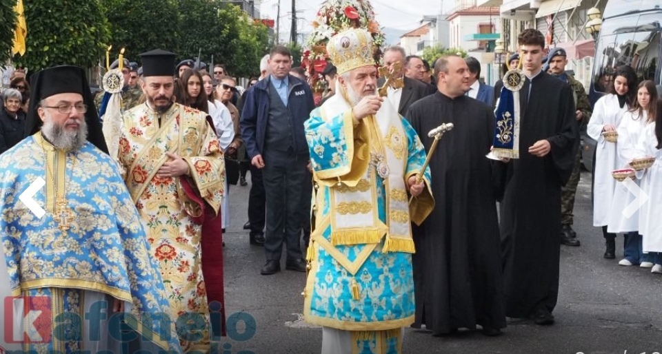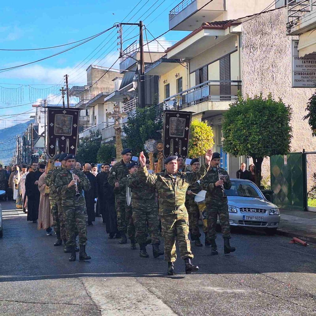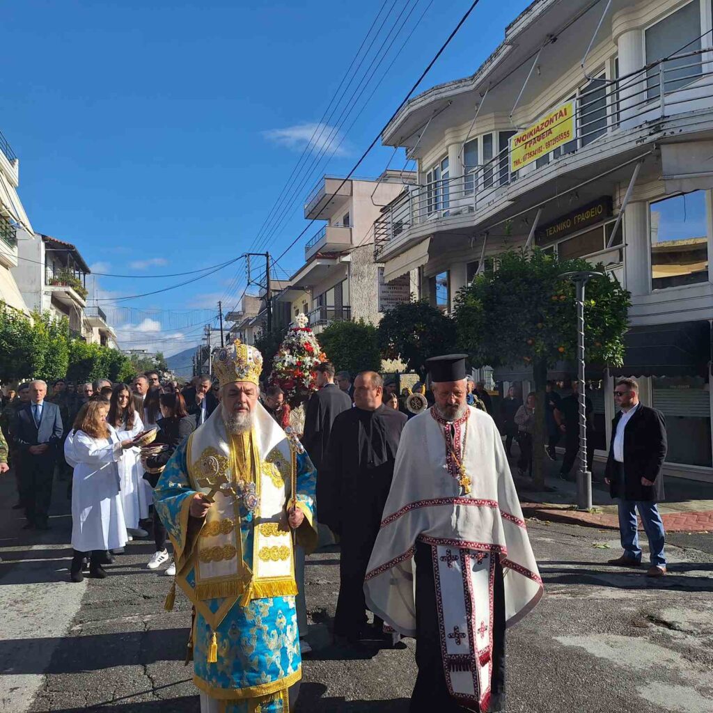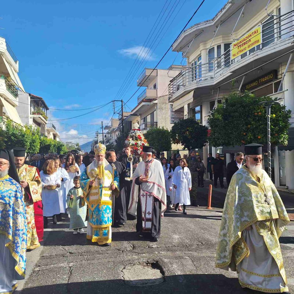 Μετά το πέρας της Θείας Λειτουργίας πραγματοποιήθηκε η λιτάνευση της ιεράς εικόνος του Αγίου στους κεντρικούς δρόμους της πόλεως, με τη συνοδεία τιμητικού στρατιωτικού αγήματος, της Φιλαρμονικής του Στρατού και του Δήμου, των Μαθητών και Μαθητριών των Σχολείων της Πόλεως, των τοπικών αρχών και πλήθους πιστών.